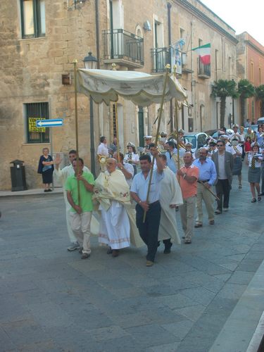 Precedono il “Corpus Christi” un corteo di bambini che indossano gli abiti bianchi della prima comunione, i quali lungo il tragitto ricoprono le strade del paese con petali di rose e di gerani mentre sui balconi delle case si espongono le doti ricamate più antiche e di migliore manifattura.